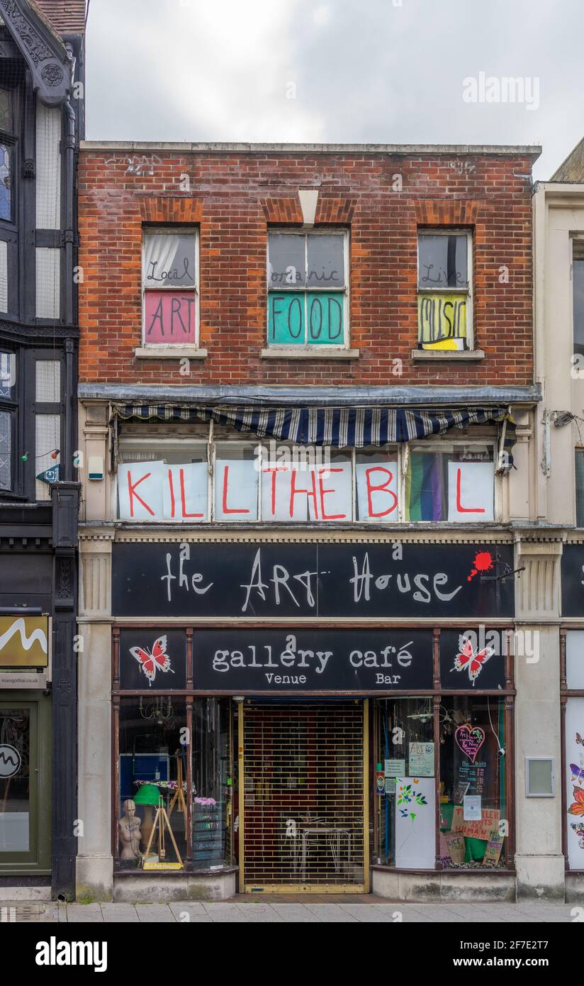Kill The Bill Banner In The Windows Of The Art House Cafe In Southampton England Uk Stock Photo Alamy